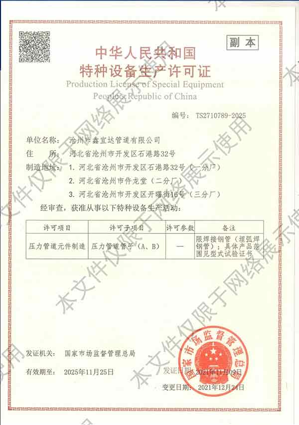 滄州市鑫宜達(dá)管道有限公司成立于2003年7月,坐落于滄州經(jīng)濟(jì)開(kāi)發(fā)區(qū),占地面積40萬(wàn)平方米,注冊(cè)資金1.81億元,是集螺旋鋼管生產(chǎn)、防腐加工以及無(wú)縫鋼管、卷板、帶鋼等品類(lèi)鋼材經(jīng)營(yíng)銷(xiāo)售于一體的工貿(mào)型企業(yè)。公司現(xiàn)有員工400多人,其中,中高級(jí)技術(shù)職稱(chēng)的人員達(dá)120余名。 滄州市鑫宜達(dá)管道有限公司擁有9條螺旋鋼管生產(chǎn)線和3PE防腐生產(chǎn)線,可生產(chǎn)直徑219--3640mm,壁厚5.5--28mm,最高鋼級(jí)X100的各種規(guī)格防腐螺旋鋼管...